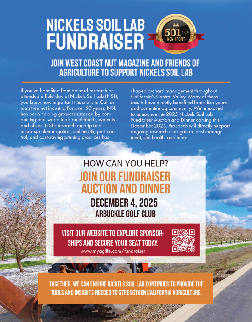 At West Coast Nut, we are deeply committed to the future of California agriculture, that’s why we proudly support Nickels Soil Lab (NSL), operated by the Leslie J. Nickels Trust, year after year. A heartfelt thank-you to everyone who has been generously supporting NSL over the years and we would like to invite you to the 2025 Fundraiser Auction and Dinner on December 4th at the Arbuckle Golf Club.