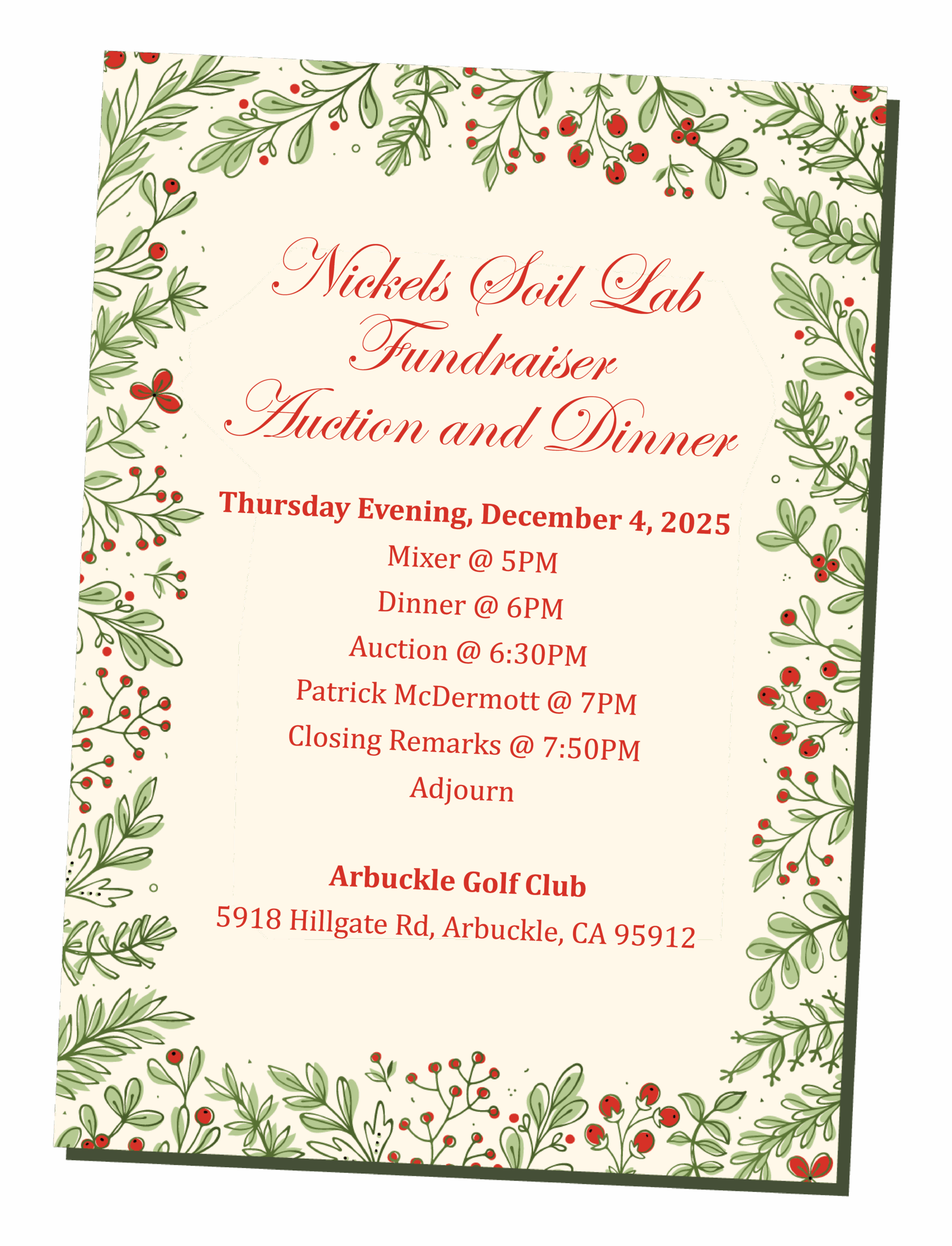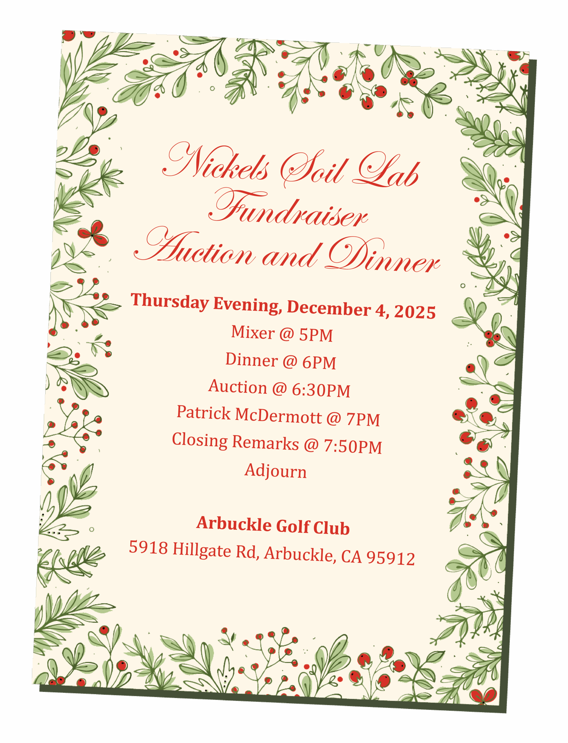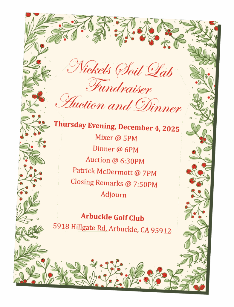 3. Share in your newsletter or social channels: feel free to copy/paste this text: “Nickels Soil Lab Fundraiser Dinner on Dec 4, 2025 (Arbuckle, CA). Join us at Arbuckle Golf Club for dinner, a live auction, and entertainment by comedian Patrick McDermott, supporting grower-focused research at Nickels Soil Lab. Sponsor a table, donate an auction item, or attend. Details and tickets: https://myaglife.com/fundraiser/”